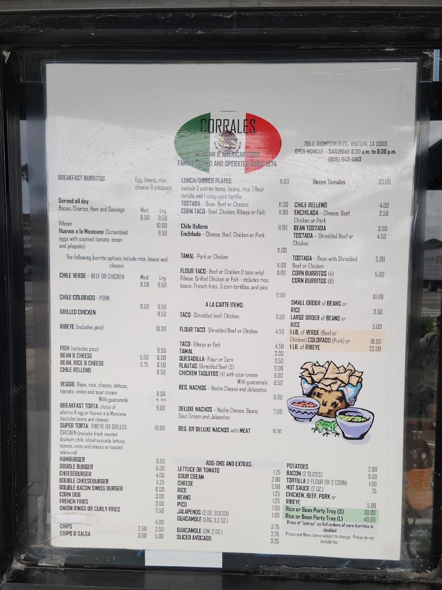 Corrales Mexican Food in Ventura, CA, offers a vibrant and authentic Mexican dining experience that keeps locals coming back. Their menu is a delicious blend of classic Mexican staples and popular American favorites, perfect for takeout or dining in. Highlighted by their famous burritos—especially the chicken, asada, and ribeye varieties—each bite bursts with fresh, flavorful ingredients and expertly balanced spices. The breakfast burritos are a standout, consistently praised for their hearty portions and rich taste.